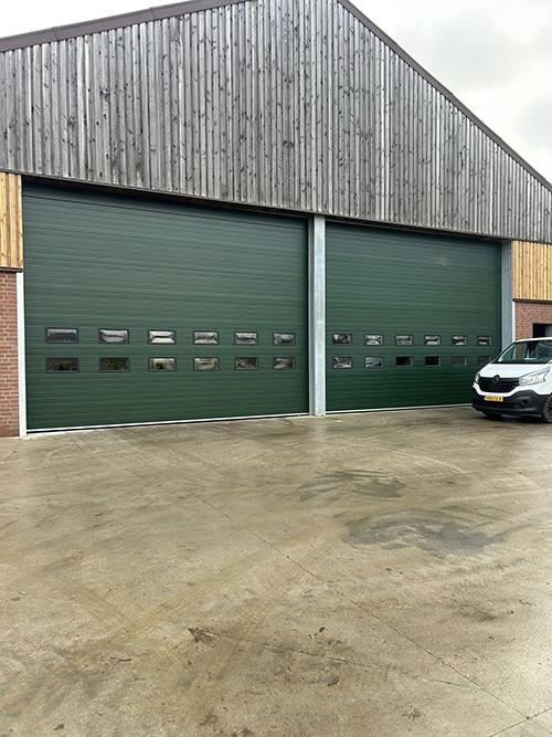 Voor een bedrijf in Cadier en Keer hebben wij recentelijk drie hoogwaardige sectionale bedrijfsdeuren geplaatst. De deuren hebben een dikte van 80 mm en de afmetingen zijn breedte 6500 mm en hoogte 4950 mm. Uitgevoerd in RAL-kleur 6009, sluiten de deuren perfect aan bij de uitstraling van het pand.