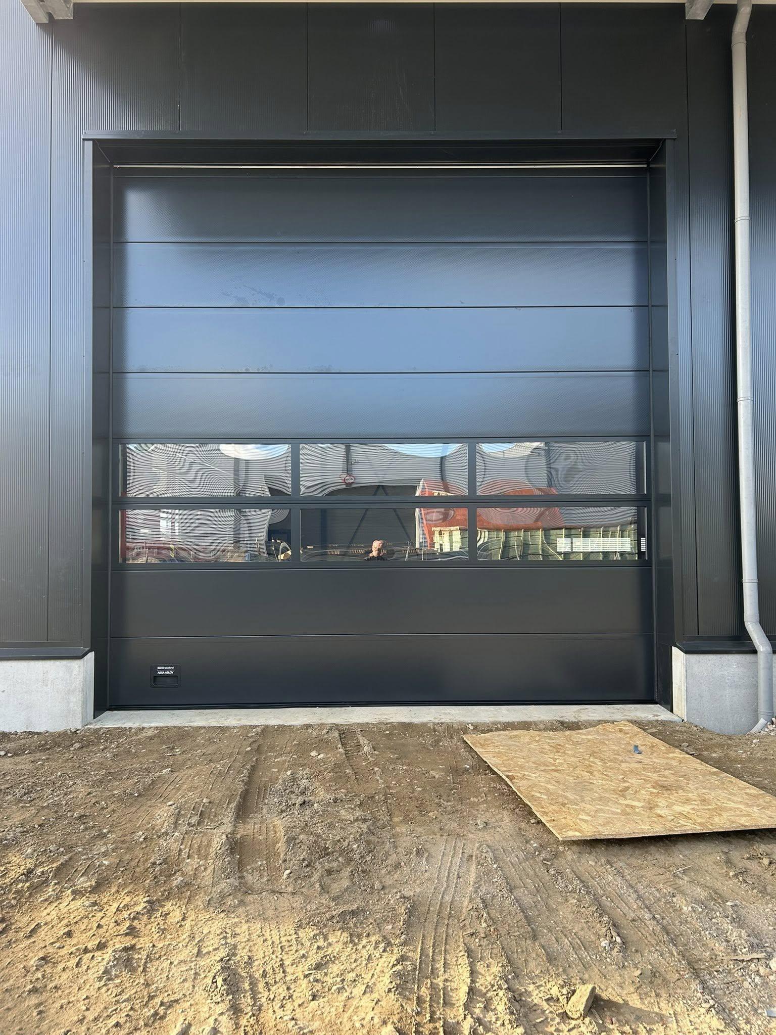 Voor een bedrijf in Echt hebben we drie sectionale bedrijfsdeuren geplaatst in verband met een aanbouw. De deuren hebben een afmeting van 4500 mm breed en 4500 mm hoog en zijn uitgevoerd in RAL 7021. Voor extra lichtinval en overzicht zijn de deuren voorzien van twee aluminium raamsecties en zijn volledig elektrisch bedienbaar.