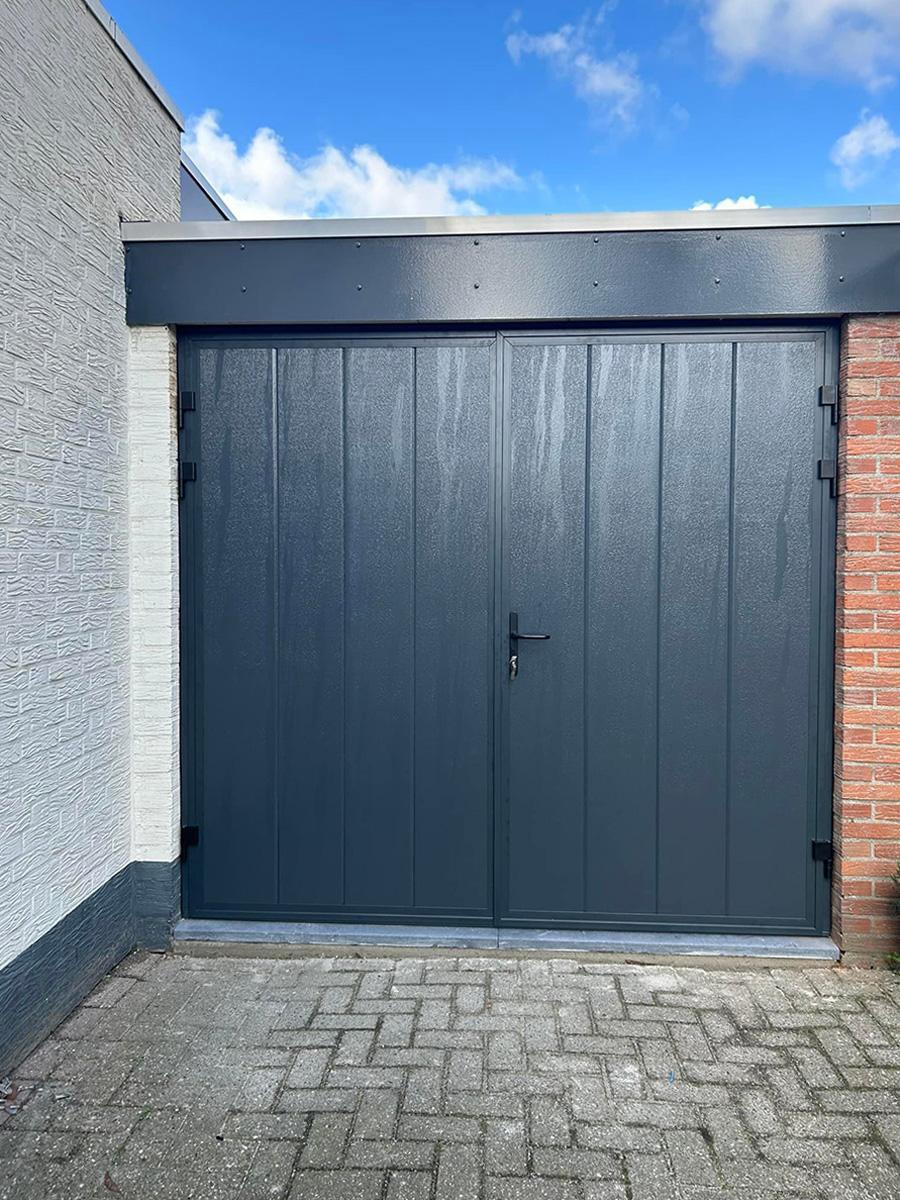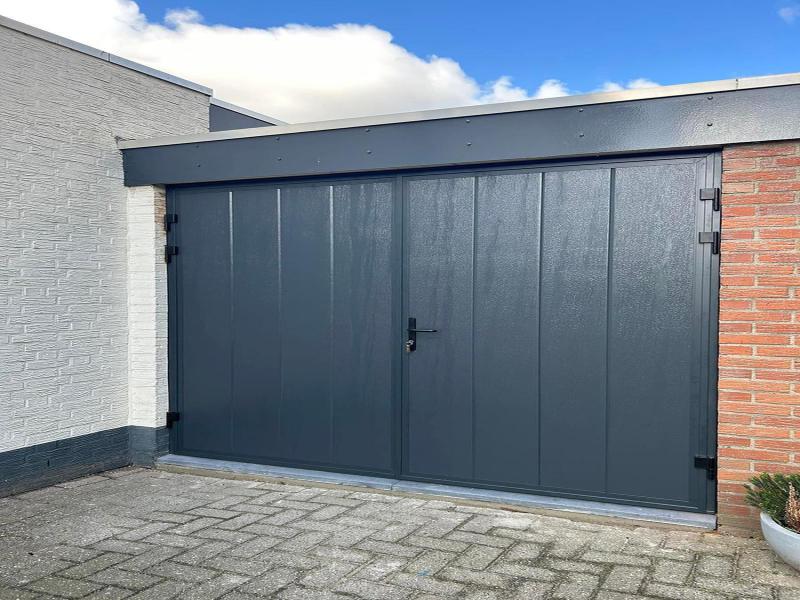Deze vleugeldeur, geplaatst in Echt, heeft een houtnerf design met een verticaal gelijnde midrib, wat zorgt voor een stijlvolle en natuurlijke uitstraling. De deur is afgewerkt in de RAL kleur 7016, een moderne antraciet tint die perfect past bij verschillende gevels. Voor extra veiligheid is de deur voorzien van een 3-puntsluiting en optilbeveiliging, waardoor inbraakpreventie gegarandeerd is. Deze vleugeldeur combineert esthetiek met functionaliteit en biedt zowel een elegante uitstraling als uitstekende beveiliging voor uw woning.